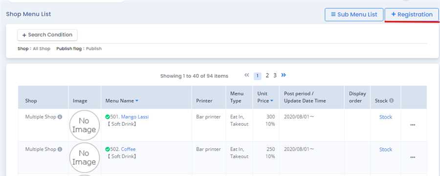 Click on Shop menu and you find the Menu Tab, go through the menu tab, and click on Menu, then you will find the Menu List with registered menu with their information, where you will find the Registration button on the top right.