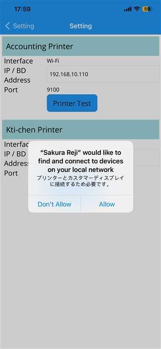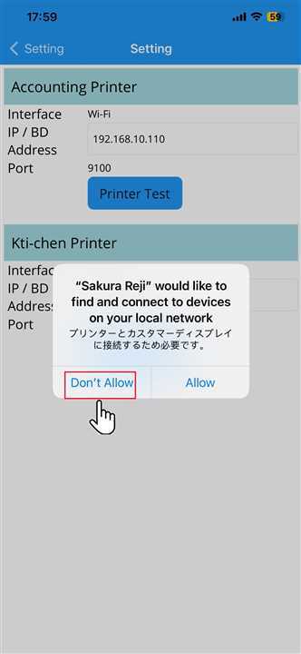 Turn on the access to the "Sakura Reji".Try the printer settings again. If it still doesn't print then try restarting your device and printer as well and try again