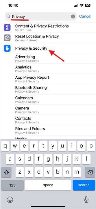 Search for privacy and security in the settings. Tap on "Privacy & Security".