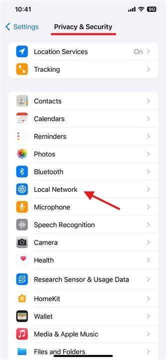 Inside the Privacy & Security, look for Local Network and tap on it.