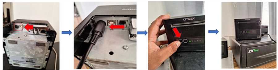 Refer to image and follow the instruction to connect power to the printer and turn it on.