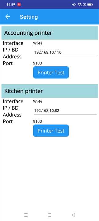 When the printer setting page appears, a list of printers that are setup for your shop is shown. Fill in the IP address box with the IP address of the printer you want and click on Printer Test button.