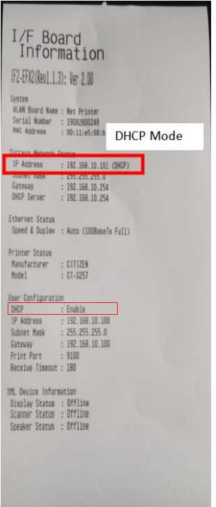 When IP mode is dynamic, the IP address of the printer may change. Check the slip if the printer IP is dynamic or static. Refer to the image to see if DHCP mode is enabled.