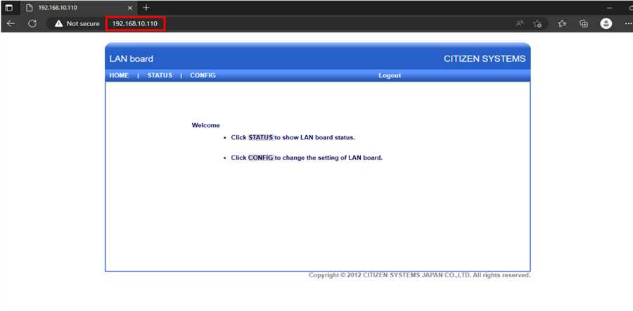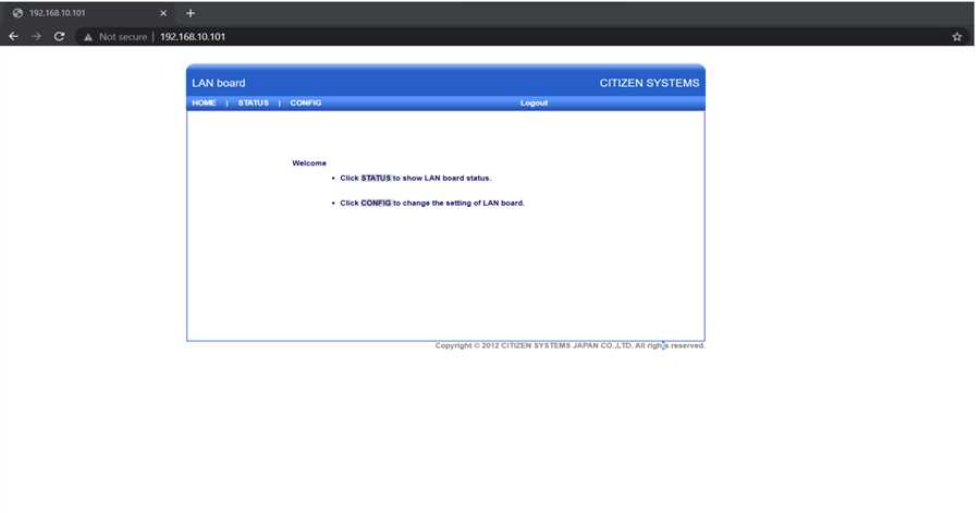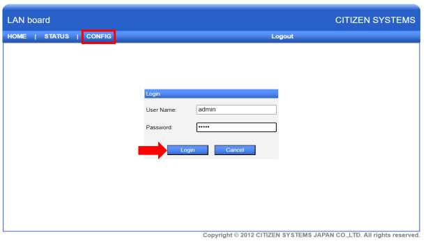 When printer setting page appears, click on CONFIG tab. A login page appears. Enter default credentials [Username: admin / Password: admin] and press Login button.