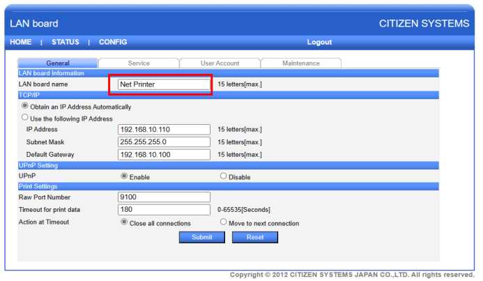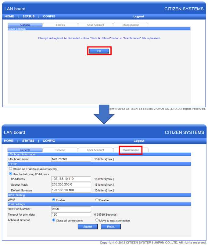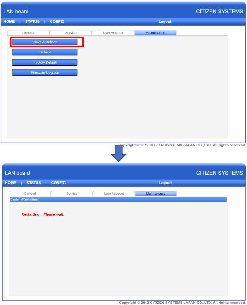 On appearing of Maintenance tab, click on 'Save & Reboot' button. The printer will restart with new configuration done in above steps.