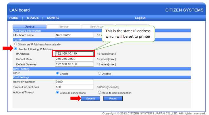 Under TCP/IP tab, click on "Use the following IP Address" option. Based on default gateway, set IP for you printer. For eg: in case of attached image, gateway is 192.168.10.100 so the IP range to set to printer is (192.168.10.101 to 192.168.10.149) . Likewise, if gateway is 192.168.1.10 then IP range is (192.168.1.11 to 192.168.1.49). After typing in the IP address click on 'Submit' button.