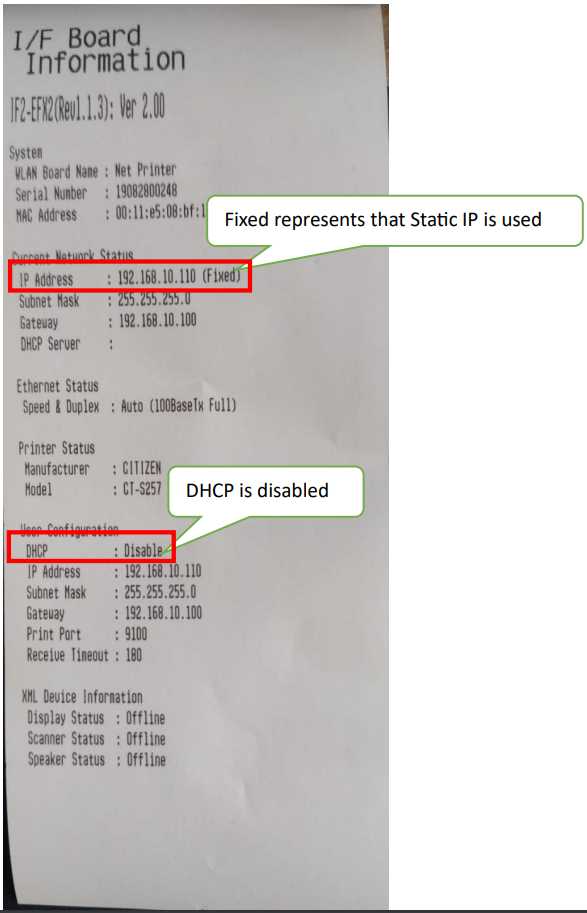 Get the IP slip from the printer and check for the IP we just fixed to the printer. Refer to image, as you can see now it has been changed from DHCP to Fixed and DHCP is disabled. Congratulations, you have successfully set static IP address to your printer.